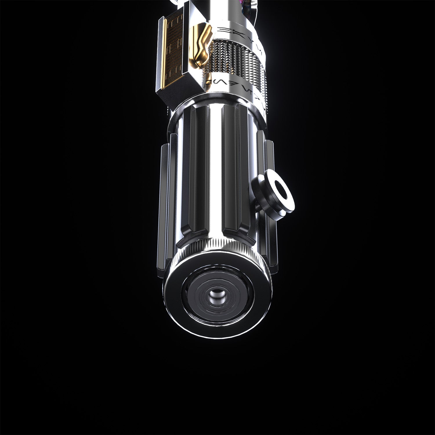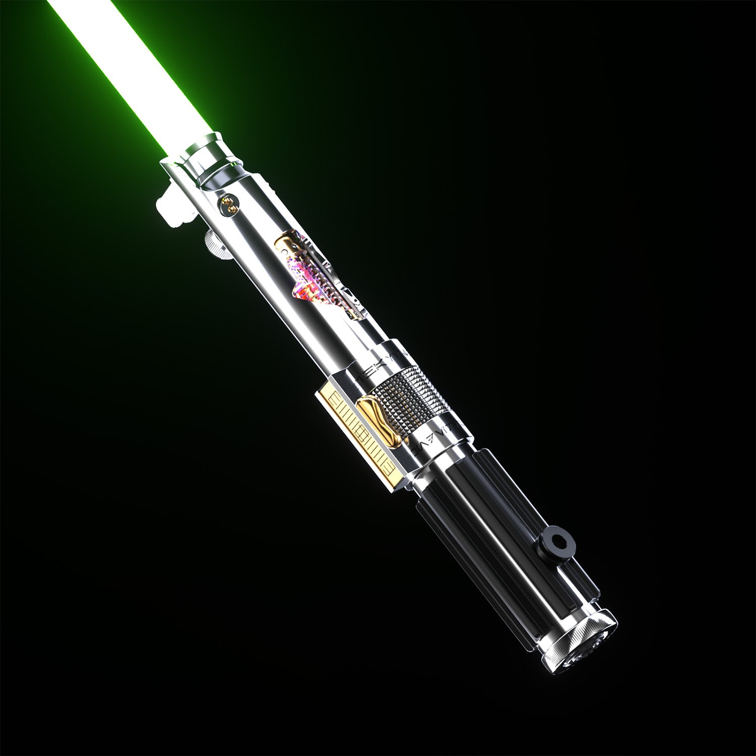 The Fallen Knight Silver (or Black) saber is a testament to refined craftsmanship and the duality of its wielder. Featuring a polished chrome-like finish and an exposed crystal chamber, this saber captures the essence of balance and inner conflict through its dynamic design.
