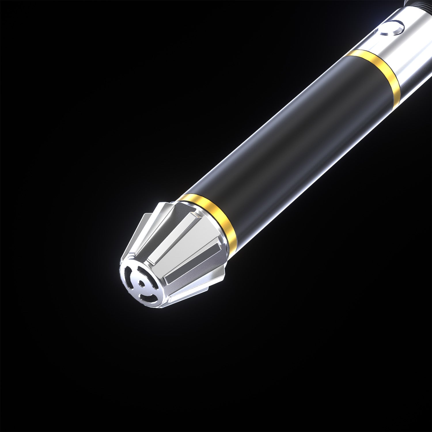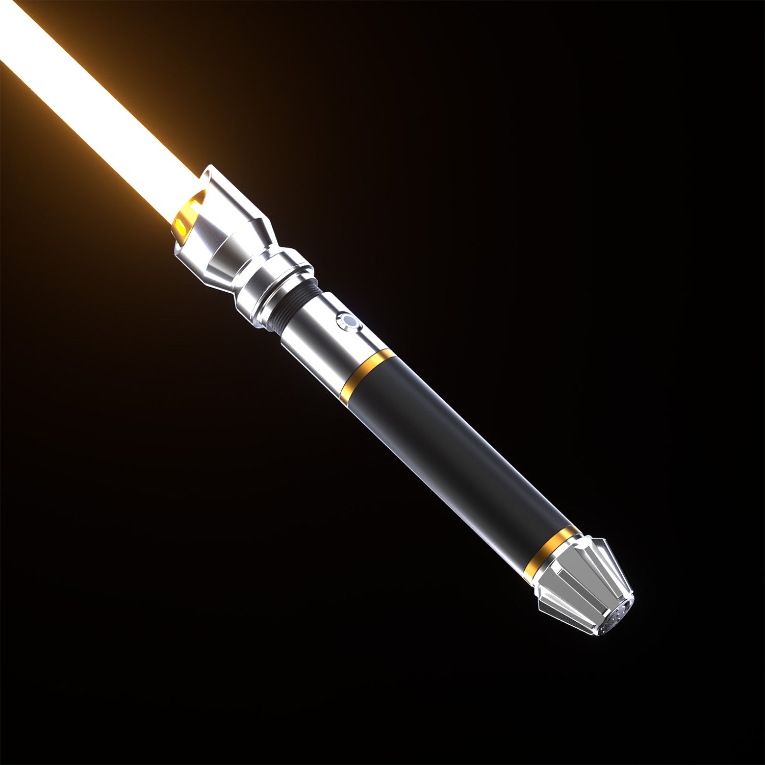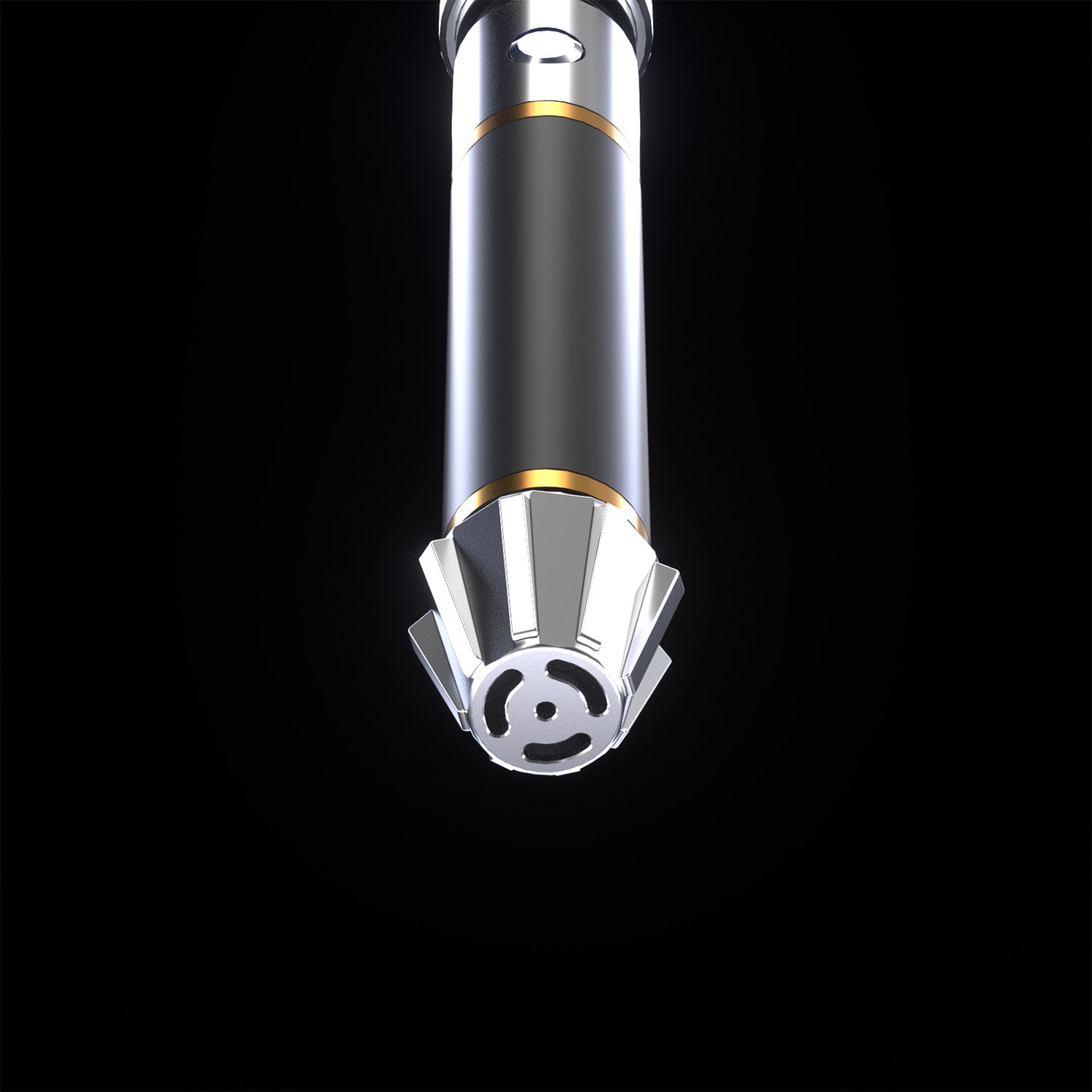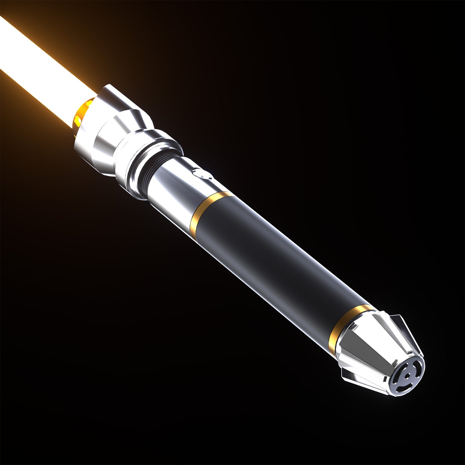 Elegant, sleek, and beautifully balanced — the Lotus saber is a true standout in any lineup. The polished silver emitter, paired with the refined gold accents, makes for a striking contrast against the black grip.